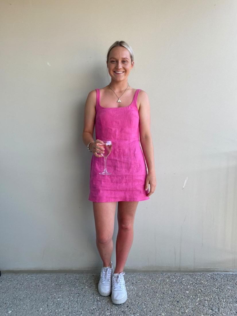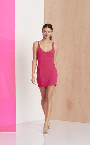 - Rounded scoop neckline and low back
