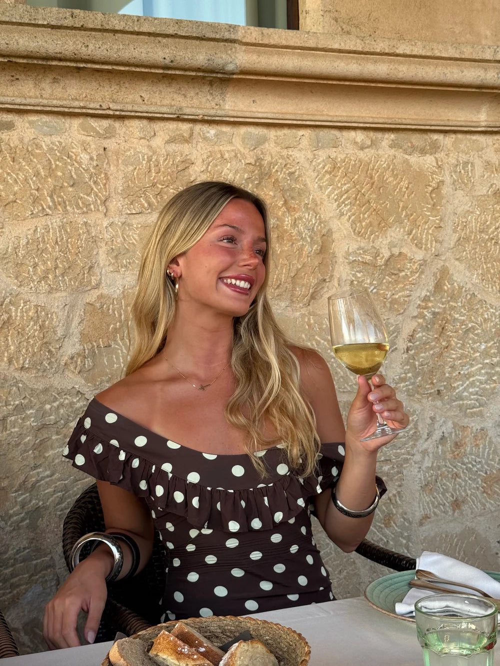 A feminine maxi dress with a timeless polka dot pattern. The design features a flattering fit with delicate ruching details at the shoulders and an elegant open back that adds a modern twist. The delicate tie straps at the sides highlight the waist, creating a beautiful silhouette.